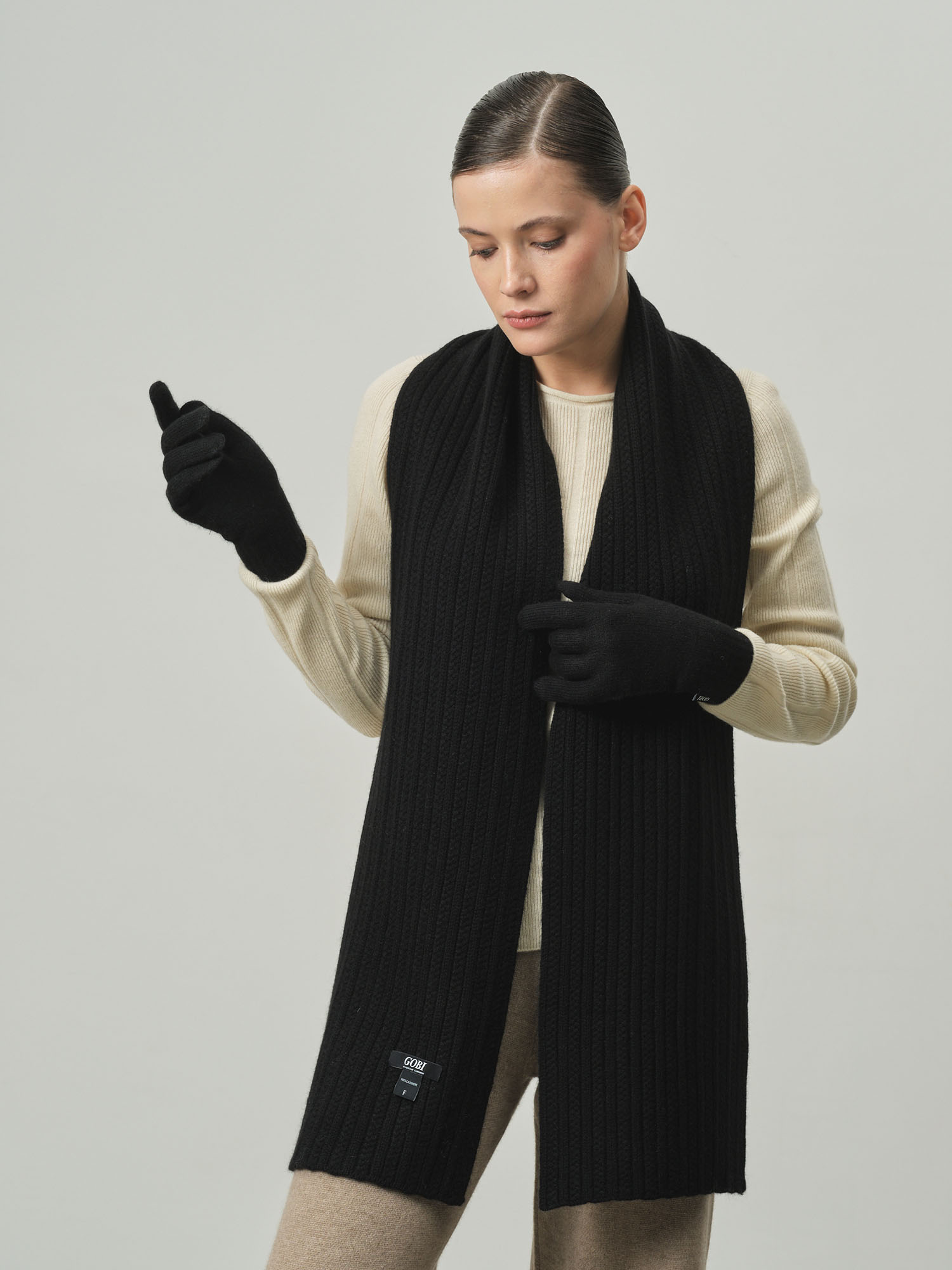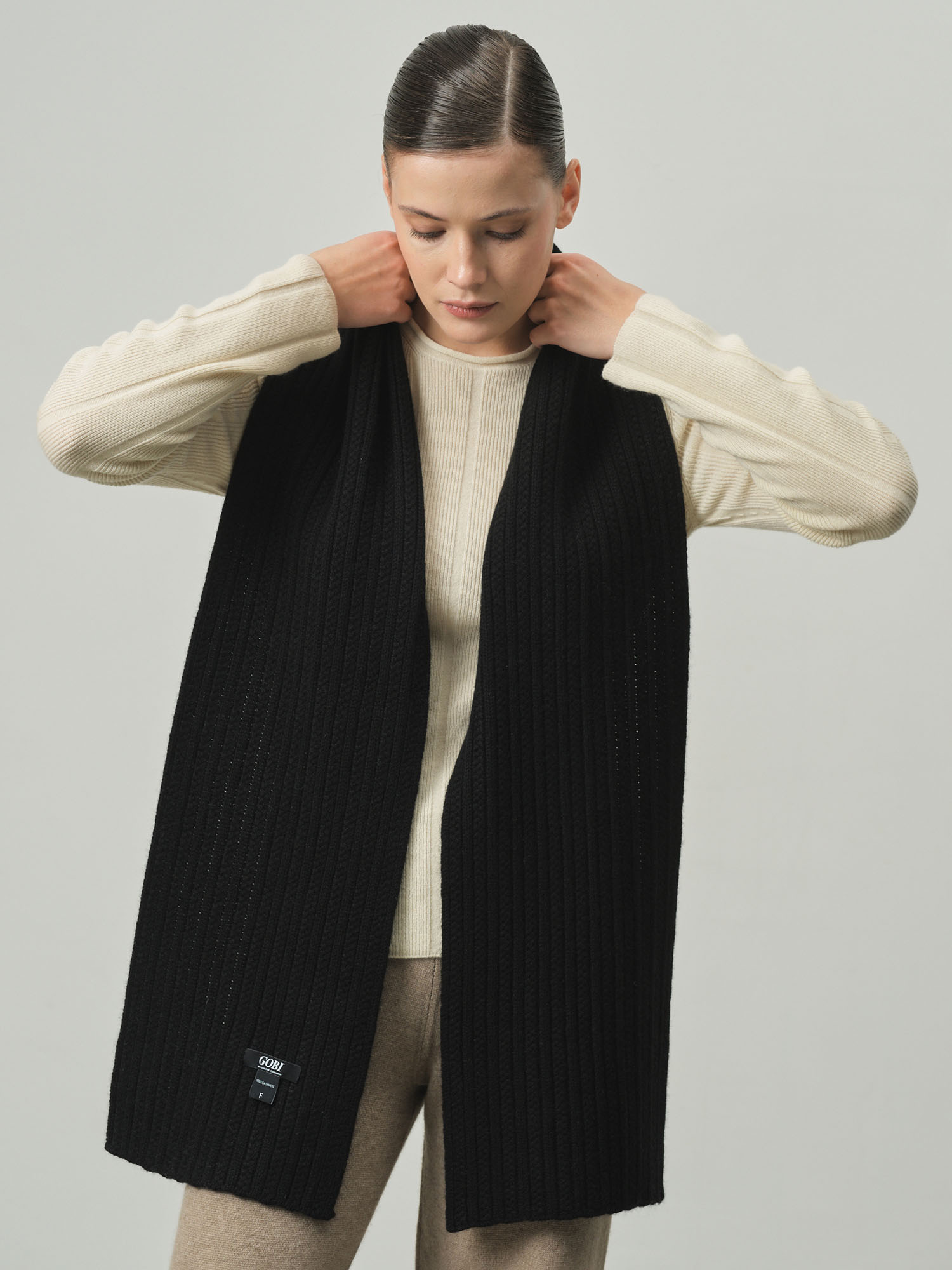 Классическая прямоугольная форма с фактурной вязкой в рубчик. Минималистичный дизайн подчёркивает благородную текстуру кашемира и делает аксессуар универсальным для разных стилей.