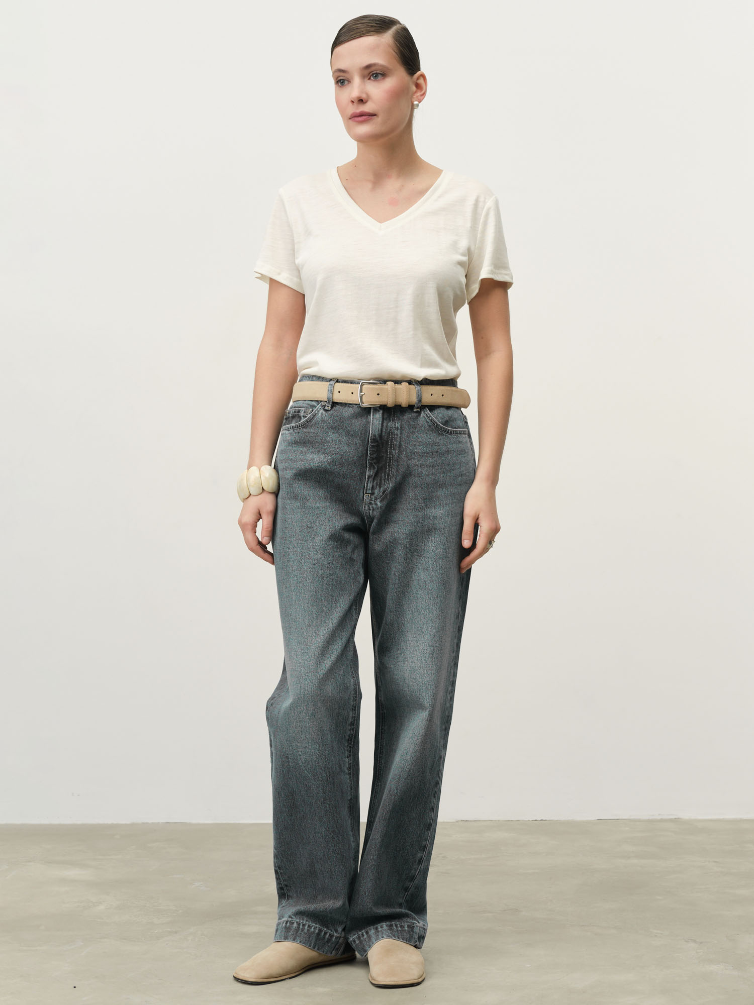 Прямой силуэт с V-образным вырезом, который визуально вытягивает линию шеи. Лаконичный крой делает модель базовой и универсальной.