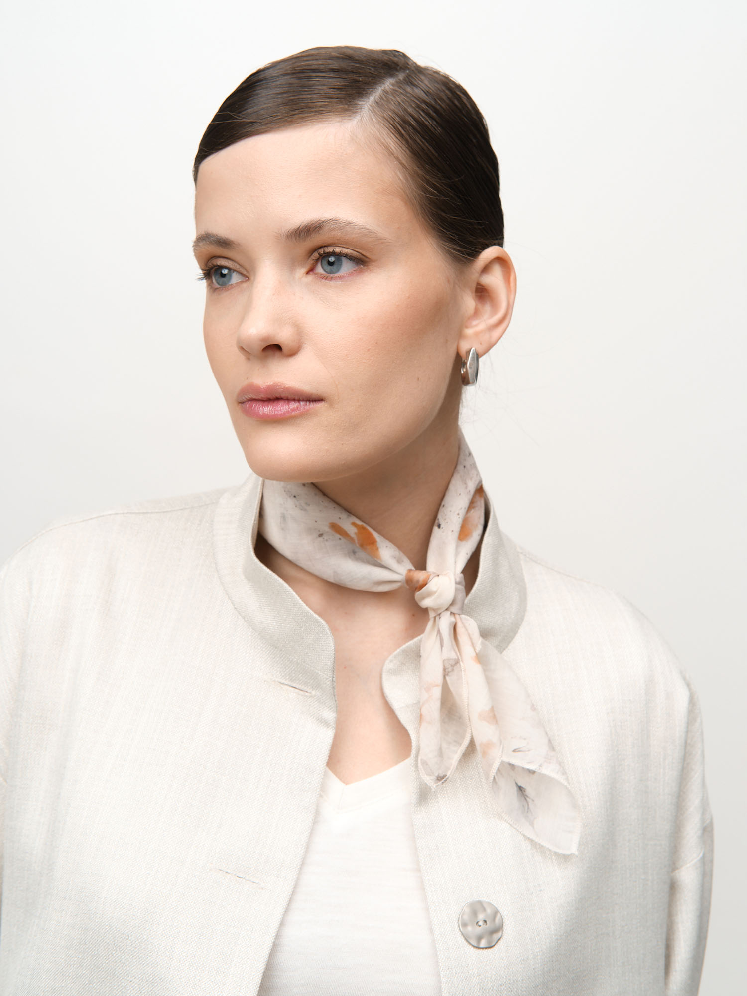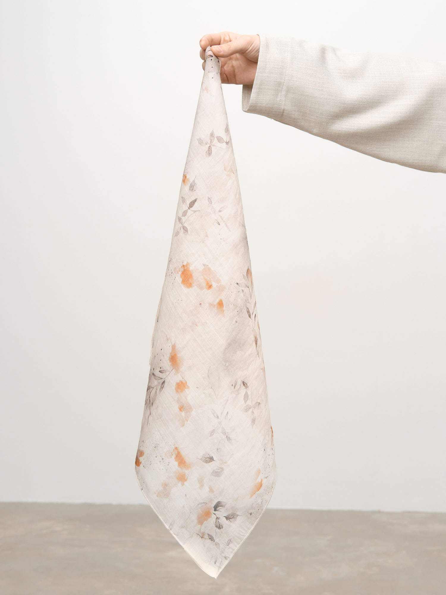 Платок с деликатным абстрактным принтом и аккуратно обработанными краями. Тонкая струящаяся ткань красиво драпируется и позволяет носить его разными способами — на шее, в волосах или на сумке.