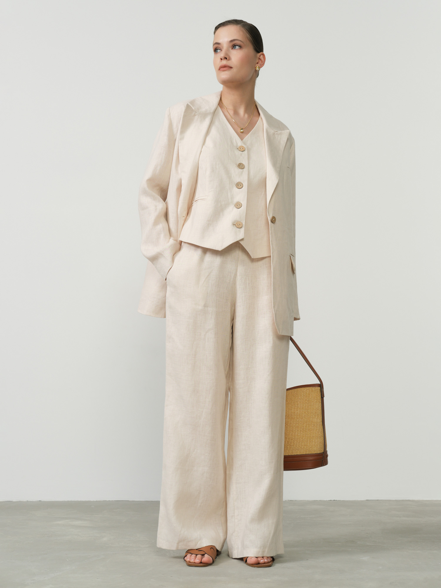 Льняной жакет бежевого цвета — идеальный выбор для летнего гардероба. Выполненный из натурального льна, он обеспечивает отличную вентиляцию и комфорт в жаркие дни. Жакет имеет классический крой с лацканами, накладные карманы и застежку на одну пуговицу, что придает образу элегантность и стиль. Этот универсальный элемент одежды прекрасно сочетается как с деловыми костюмами, так и с повседневными комплектами, создавая утонченный и современный образ.