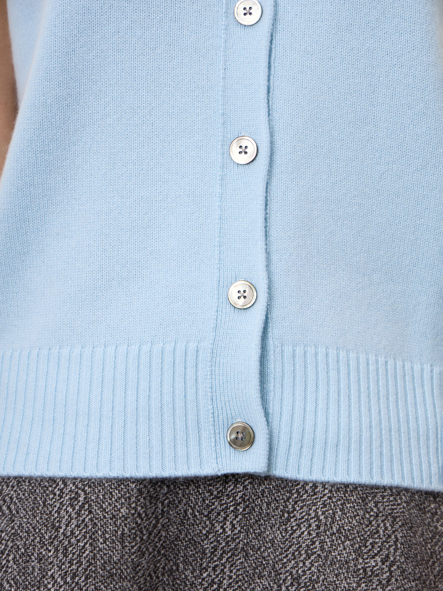 Модель выполнена в виде лёгкого вязаного жилета с V-образным вырезом и застёжкой на аккуратные пуговицы. Гладкая вязка подчёркивает благородную текстуру кашемира. Минималистичный дизайн делает изделие универсальным и элегантным.