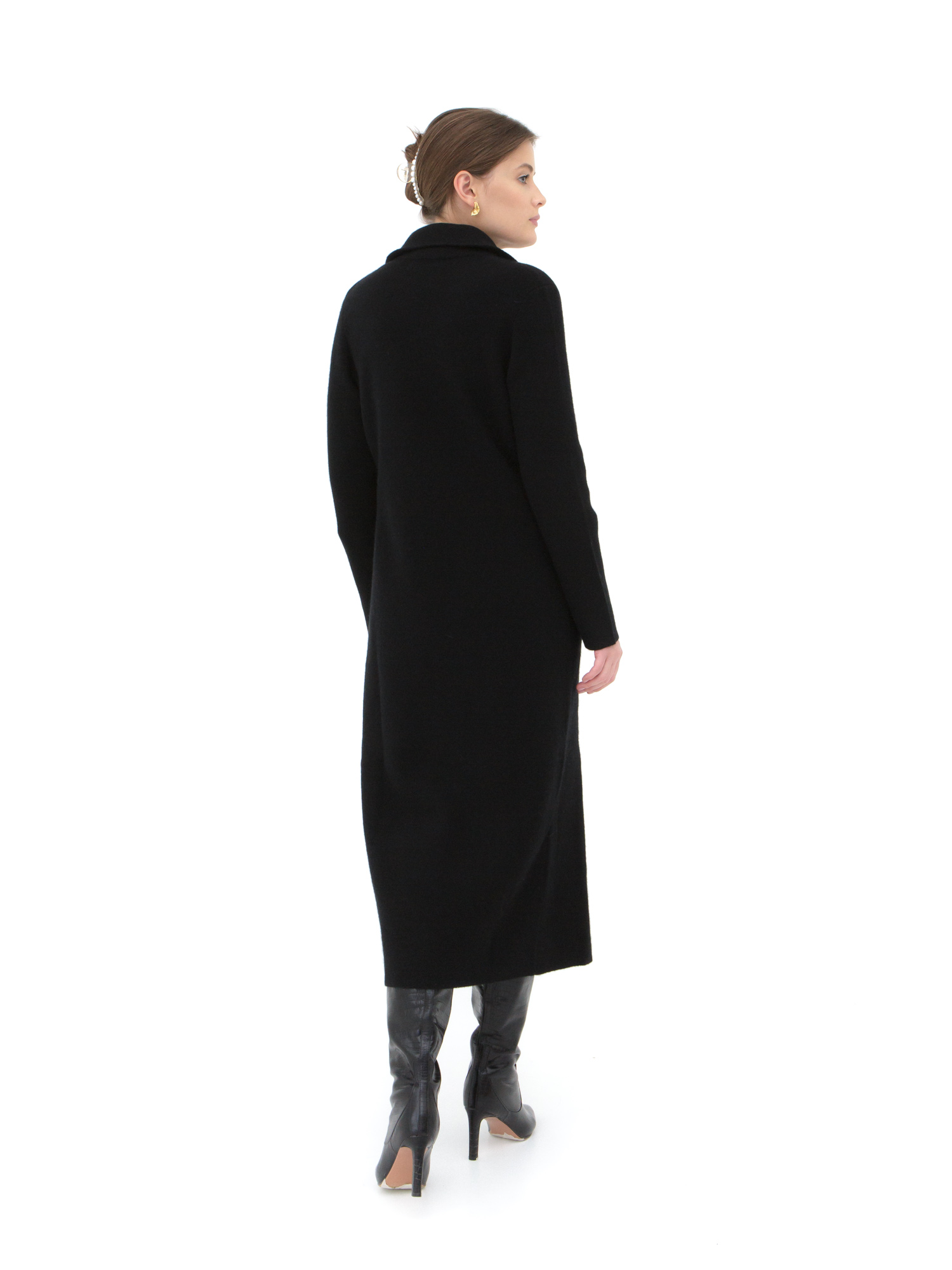 Элегантный удлинённый кардиган, сочетающий в себе благородство кашемира и тепло пуха яка. Модель выполнена в чёрном цвете с контрастным графичным узором, который придаёт образу выразительность и современный характер. Идеально подходит для многослойных образов и акцентных выходов.