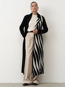 Прямой удлинённый силуэт, визуально вытягивающий фигуру. Кардиган красиво сидит как в застёгнутом, так и в распахнутом виде, подчёркивая вертикали образа.